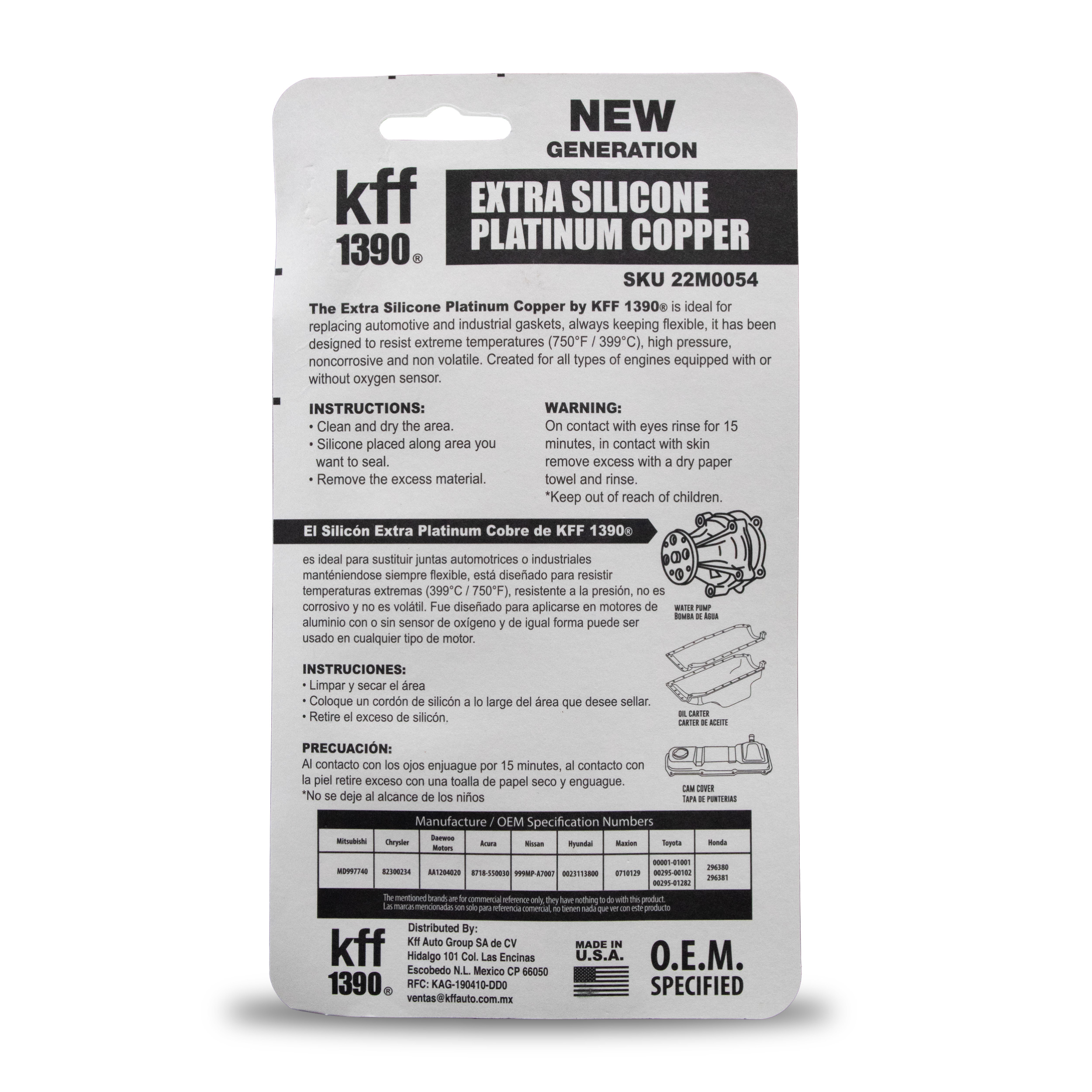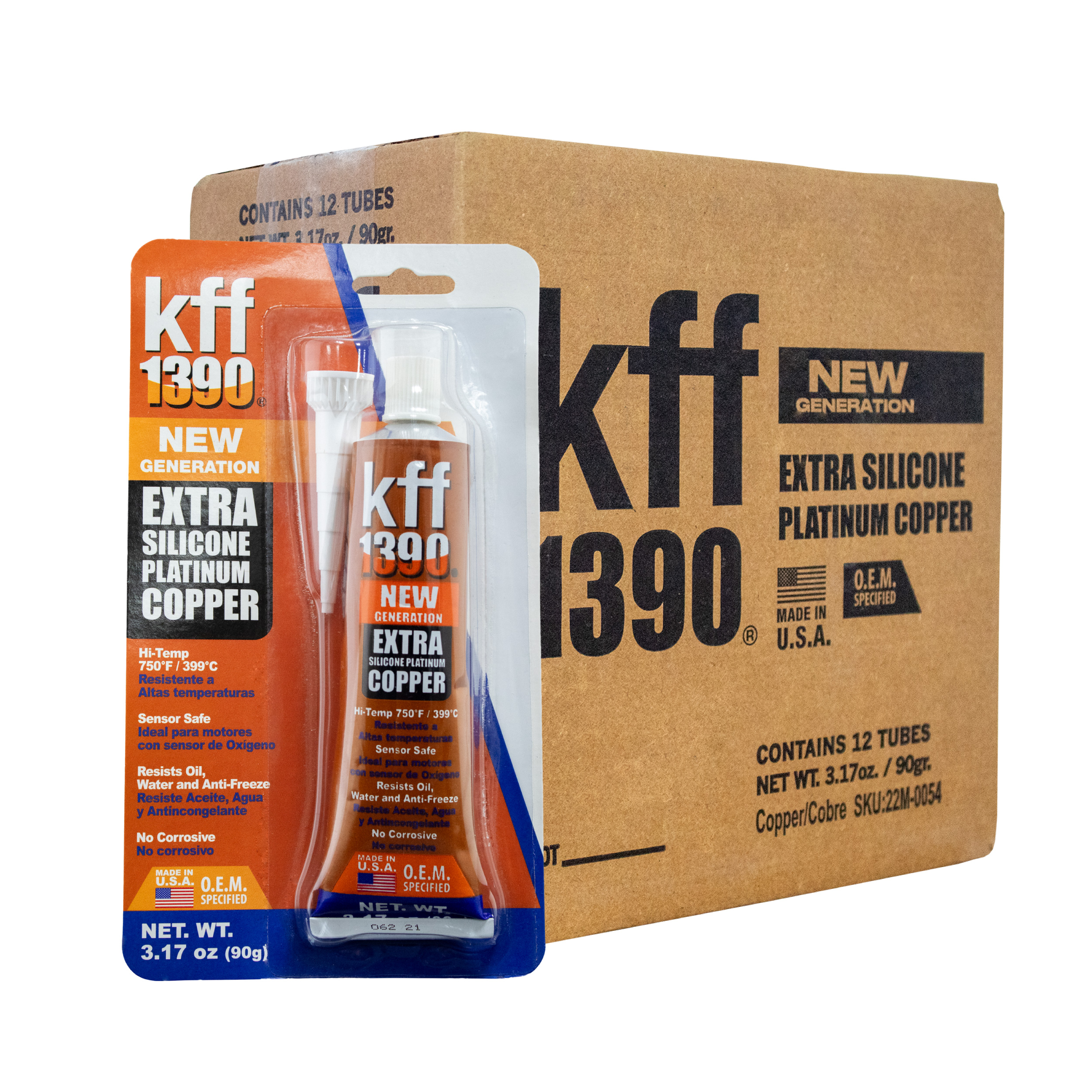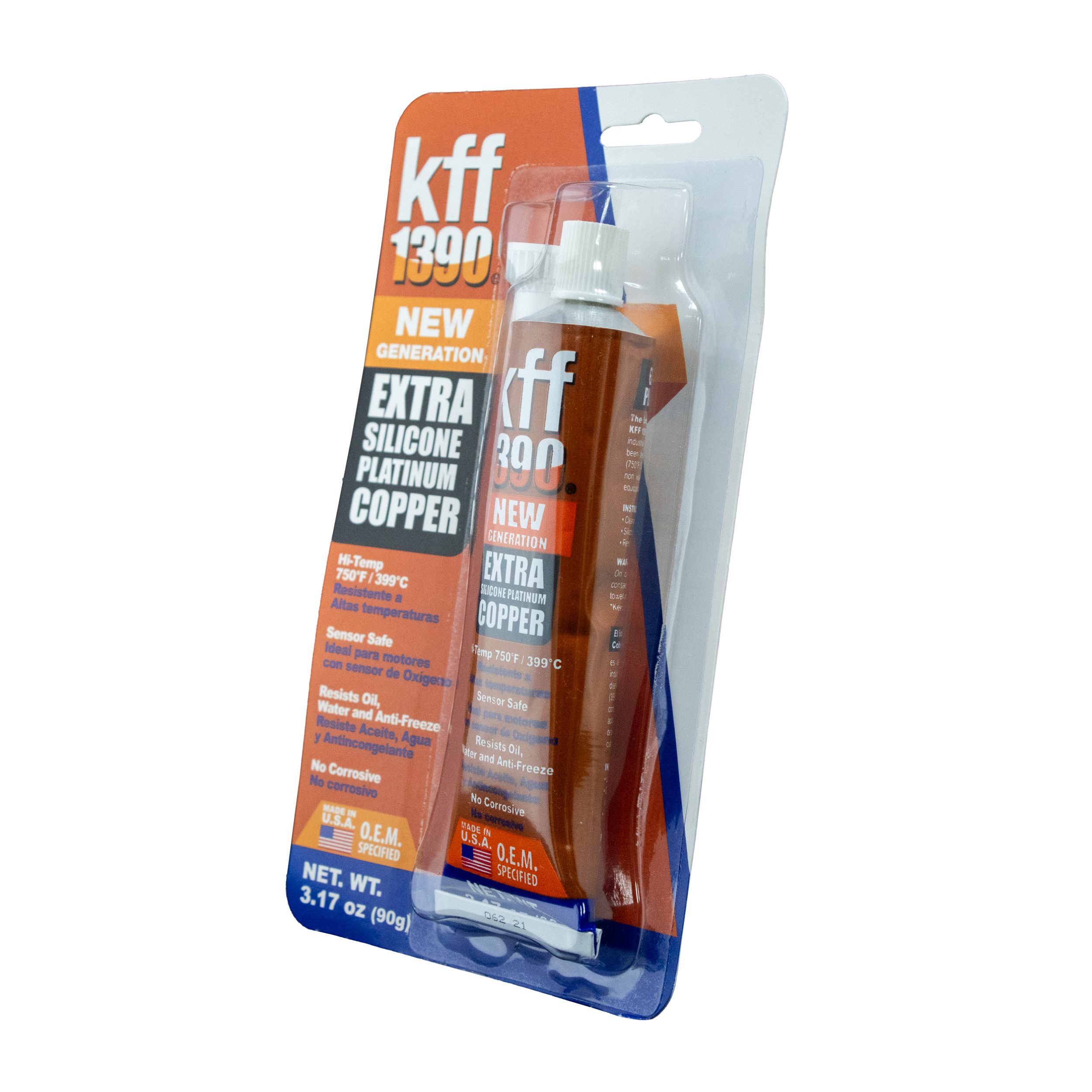 El KFF 1390 Copper New Generation es un sellador de silicón de última generación, formulado para reemplazar juntas automotrices e industriales con un desempeño superior. Su avanzada composición le permite mantener una flexibilidad permanente, incluso bajo condiciones extremas de temperatura, soportando hasta 399 °C (750 °F) sin degradarse. Altamente resistente a la presión, no corrosivo y de baja volatilidad, este sellador es compatible con sistemas que integran sensores de oxígeno (O₂) y es completamente seguro para motores fabricados en aluminio o de cualquier otro material. Su excelente adherencia y estabilidad térmica lo convierten en la solución ideal para el sellado de componentes críticos en motores de combustión interna y maquinaria de alto rendimiento.PRESENTACIONES