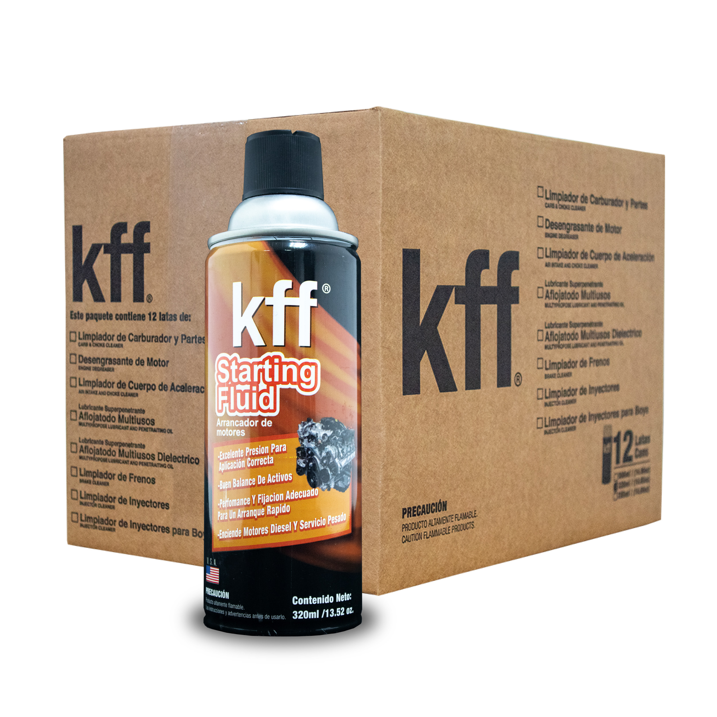 KFF Arrancador de motores es un producto ideal para el uso de motores diesel, gasolina y motores de 2 tiempos, contando con un aceite ligero que lubrica la parte superior de los cilindros. Facilita el encendido rápido de motores con problemas de ignición o en condiciones de bajas temperaturas. Es compatible con motores de combustión interna, tanto diésel como gasolina, sin importar la marca o el modelo: automóviles, camionetas, camiones de pasajeros, tractocamiones, entre otros. Debe aplicarse directamente en el purificador de aire o en el carburador para obtener mejores resultados. PRESENTACIONES