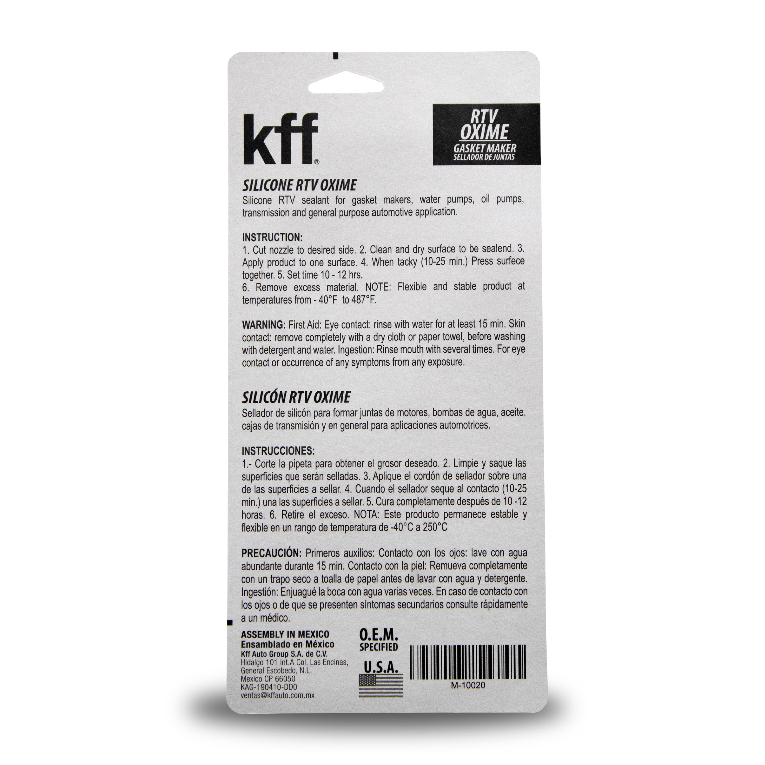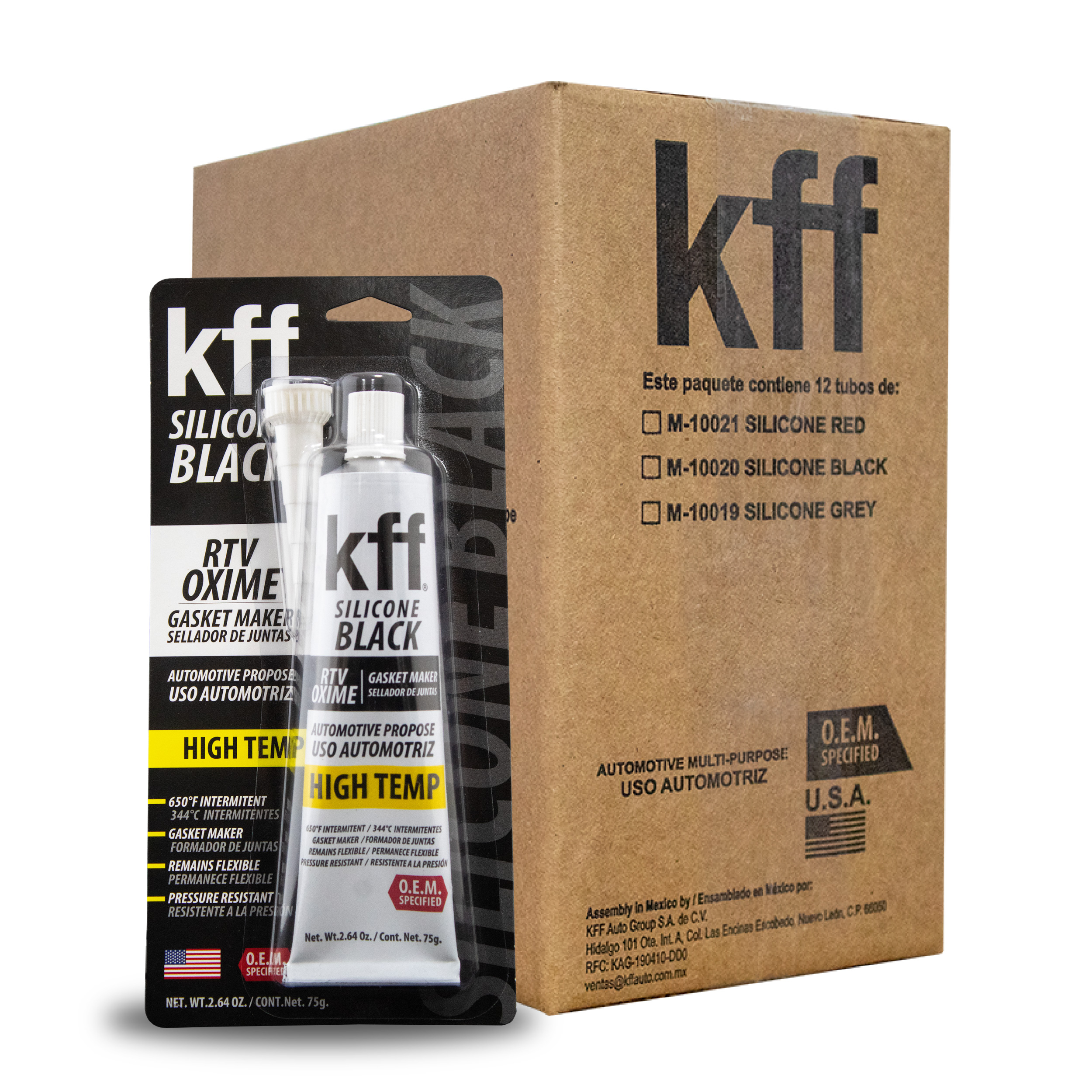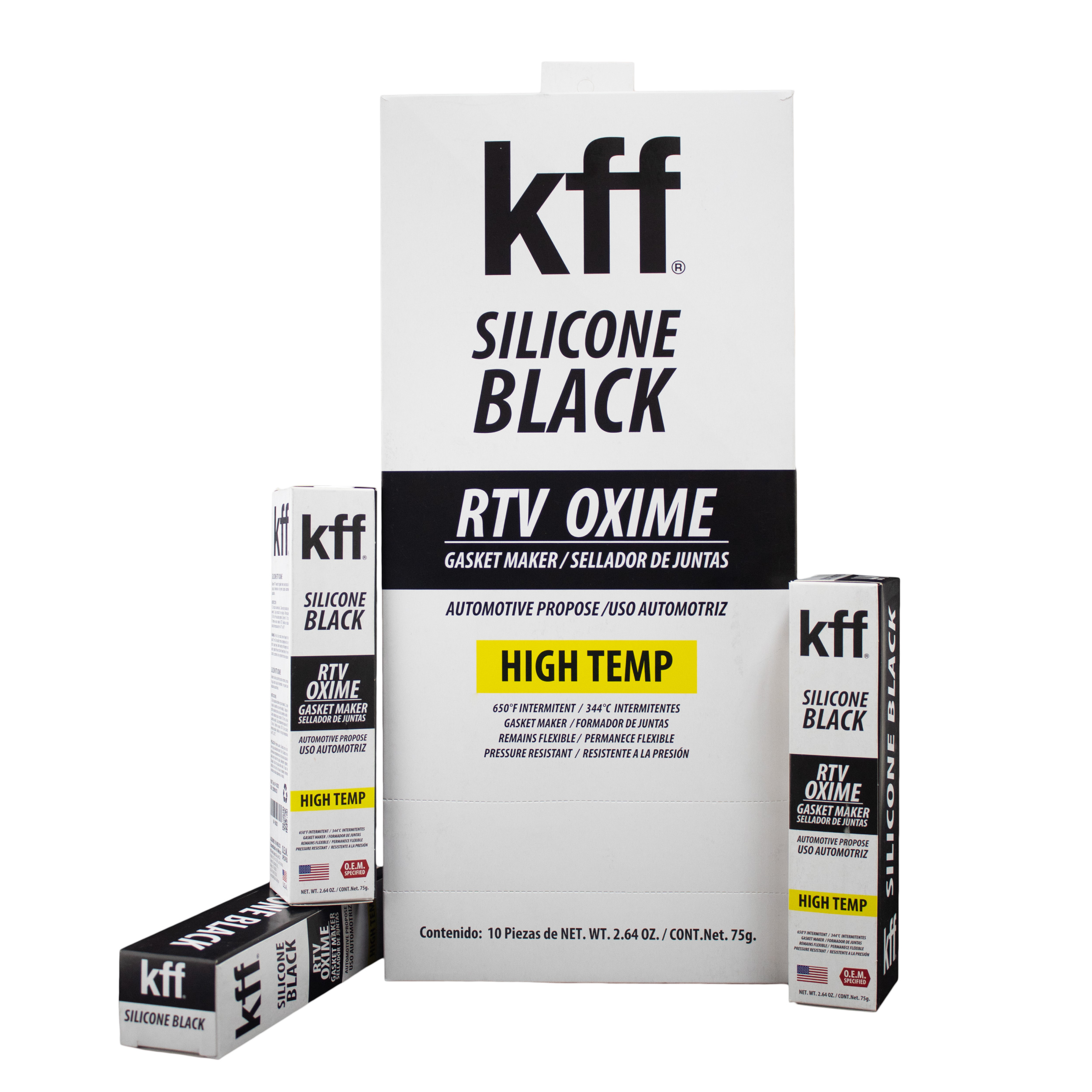 El KFF Silicone Black RTV Oxime es un sellador de silicón monocomponente de curado a temperatura ambiente, diseñado para formar juntas de cualquier forma o tamaño directamente en el sitio de aplicación. Tiene un curado rápido y seguro a temperatura ambiente, generando una junta de silicón tenaz, elástica y de alta resistencia. Ofrece una fuerte adherencia a una amplia gama de materiales como metal, vidrio, madera, cerámica, superficies pintadas, plásticos, fibras naturales y sintéticas, así como otros silicones. Este sellador mantiene su flexibilidad sin endurecerse ni agrietarse, incluso bajo exposición prolongada a ciclos térmicos, ambientes agresivos, y agentes químicos. Resiste eficazmente aceites, solventes y la mayoría de los productos químicos industriales, lo que lo hace ideal para aplicaciones donde se requiere resistencia química y térmica. Su viscosidad permite aplicaciones tanto en superficies horizontales como verticales, facilitando el trabajo en campo o línea de producción. Especialmente formulado para brindar excelente resistencia al aceite, es ideal para entornos automotrices, industriales y mecánicos de alta exigencia.PRESENTACIONES