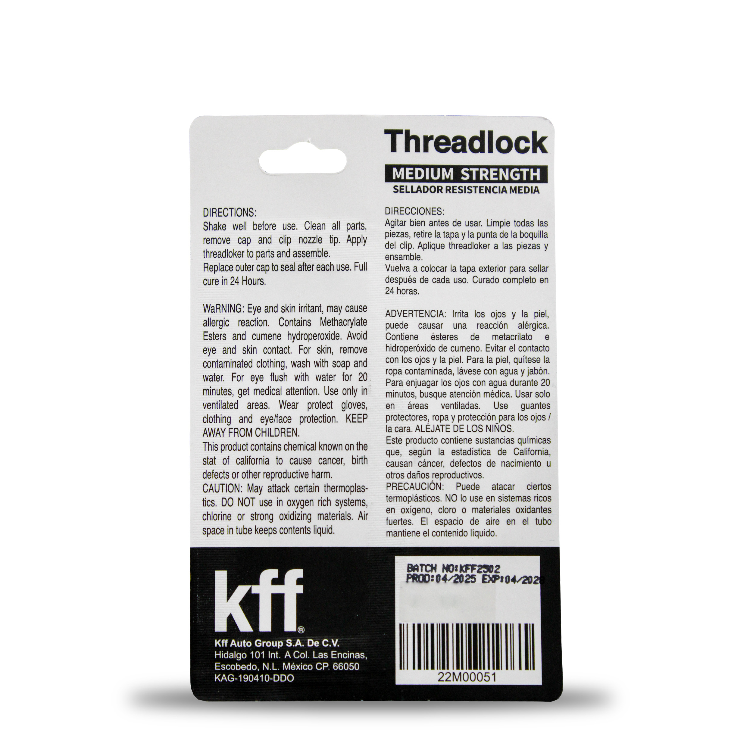 Medium Strength Thread Sealant is a one-component, anaerobic threadlocker formulated to secure and seal metal threaded joints. It cures in the absence of oxygen and in contact with metal surfaces, forming a strong bond that prevents leaks, loosening due to vibration, impact, and mechanical stress. Designed for applications on bolts between 1/4" (6 mm) and 3/4" (1.9 cm), it provides a secure hold while allowing for disassembly with hand tools. It offers excellent chemical and thermal resistance, withstanding temperatures between -54°C and +149°C. It is non-flammable, and its formula ensures a fast, clean, and reliable application in industrial and automotive environments.PRESENTATIONS